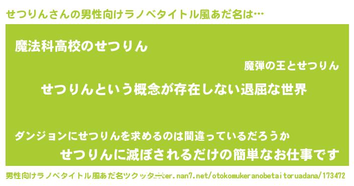 | 女子向けラノベタイトル風あだ名 | 『異世界で失敗しない100のせつりん』 |
