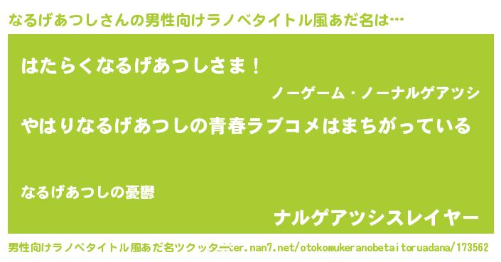 | 女子向けラノベタイトル風あだ名 | 『なるげあつしの雑貨屋さん』 |