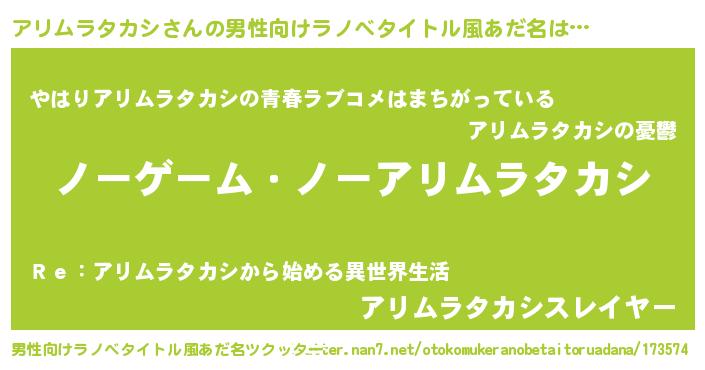 女子向けラノベタイトル風あだ名 | 『死神アリムラタカシの再婚』 |