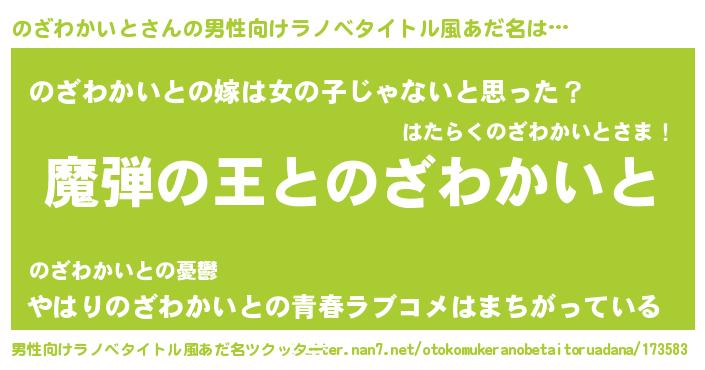 | 女子向けラノベタイトル風あだ名 | 『のざわかいとが死なない童話 林檎ののざわかいとの診療簿』 |