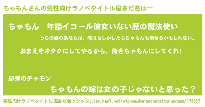 | 女子向けラノベタイトル風あだ名 | 『ちゃもん夫妻のなれそめ』 |
