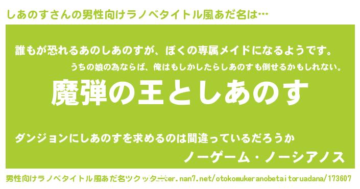 | 女子向けラノベタイトル風あだ名 | 『しあのすが死なない童話 林檎のしあのすの診療簿』 |