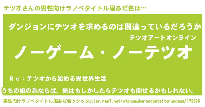 | 女子向けラノベタイトル風あだ名 | 『テツオ恋絵巻』『テツオは平凡を望む』 |