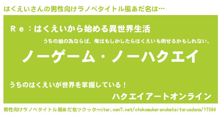 | 女子向けラノベタイトル風あだ名 | 『死神はくえいの再婚』『闇のはくえい』 |