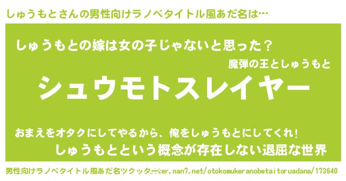 | 胡散臭い通販商品みたいなあだ名 | 『信頼と実績のペンダント…その名も「しゅうもと」』 |