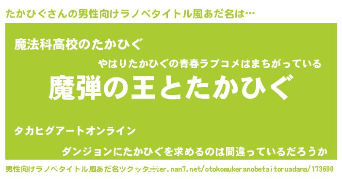 | 女子向けラノベタイトル風あだ名 | 『乙女ゲームの破滅フラグしかない悪役たかひぐに転生してしまった…』 |