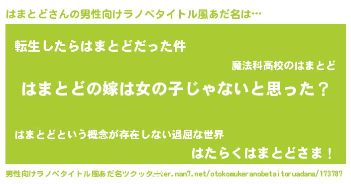 | 女子向けラノベタイトル風あだ名 | 『はまとど様がみてる』 |