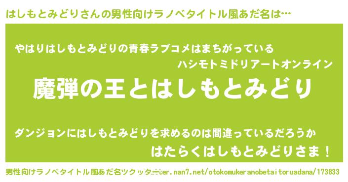 | 女子向けラノベタイトル風あだ名 | 『はしもとみどりが死なない童話 林檎のはしもとみどりの診療簿』 |