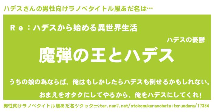 | 女子向けラノベタイトル風あだ名 | 『ハデスが死なない童話 林檎のハデスの診療簿』 |