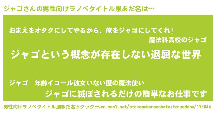 | 女子向けラノベタイトル風あだ名 | 『異世界で失敗しない100のジャゴ』 |