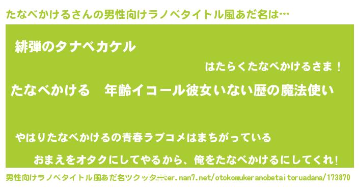 | 女子向けラノベタイトル風あだ名 | 『たなべかけるの玉の輿計画!』 |