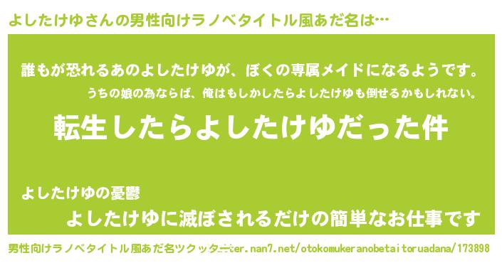 | 女子向けラノベタイトル風あだ名 | 『婚約破棄系悪役よしたけゆに転生したので、保身に走りました。』 |