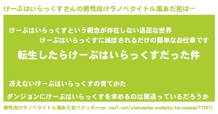| 胡散臭い通販商品みたいなあだ名 | 『来世でも幸せになれる水素水…その名も「けーぷはいらっくす」』 |