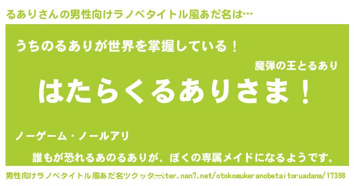 | 胡散臭い通販商品みたいなあだ名 | 『絶対に幸福をもたらす招き猫…その名も「るあり」』 |