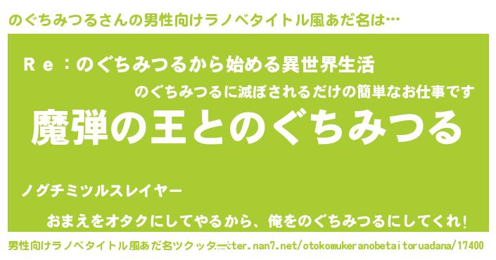 | 女子向けラノベタイトル風あだ名 | 『のぐちみつるが死なない童話 林檎ののぐちみつるの診療簿』 |