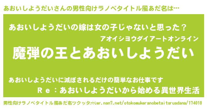 | 胡散臭い通販商品みたいなあだ名 | 『世界中を虜にした100年もののヴィンテージワイン…その名も「あおいしようだい」』 |