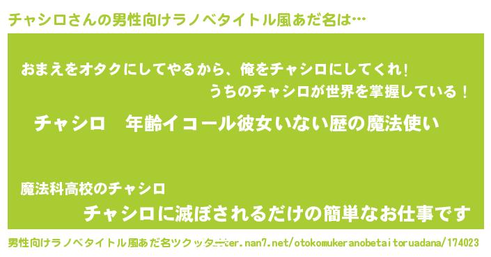| 女子向けラノベタイトル風あだ名 | 『チャシロの玉の輿計画!』 |