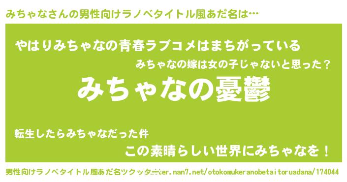 | 女子向けラノベタイトル風あだ名 | 『(仮)みちゃなのやんごとなき事情』 |