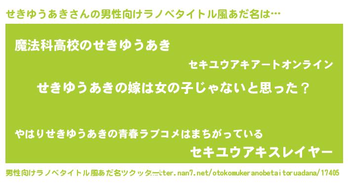 | 女子向けラノベタイトル風あだ名 | 『せきゆうあきの卵を拾いまして』 |