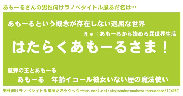 | 胡散臭い通販商品みたいなあだ名 | 『絶対に幸福をもたらす水素水…その名も「あもーる」』 |