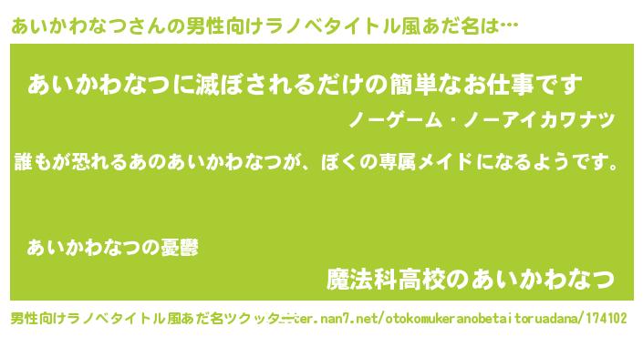 | 胡散臭い通販商品みたいなあだ名 | 『来世でも幸せになれる水素水…その名も「あいかわなつ」』 |