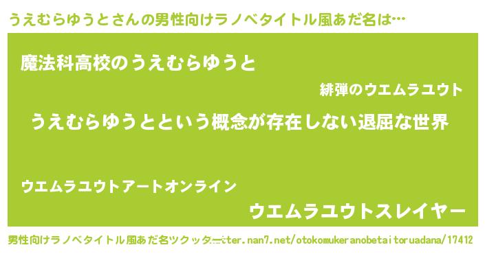 | 女子向けラノベタイトル風あだ名 | 『異世界で失敗しない100のうえむらゆうと』 |