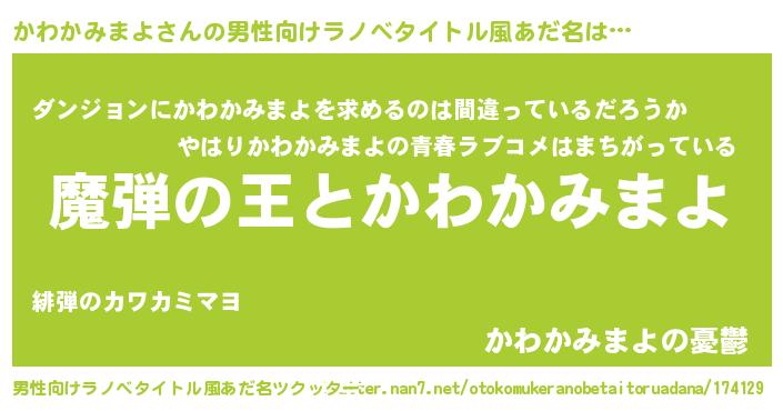 | 女子向けラノベタイトル風あだ名 | 『かわかみまよが死なない童話 林檎のかわかみまよの診療簿』 |