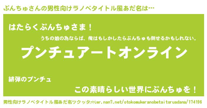 | 女子向けラノベタイトル風あだ名 | 『誰かこのぷんちゅを説明してください! ~契約から始まるウェディング~』 |