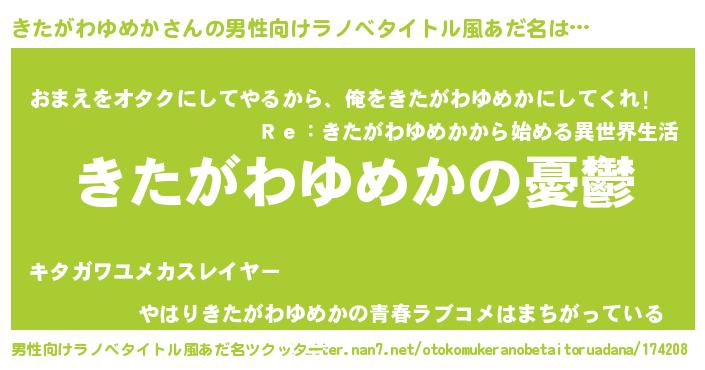 | 女子向けラノベタイトル風あだ名 | 『(仮)きたがわゆめかのやんごとなき事情』 |