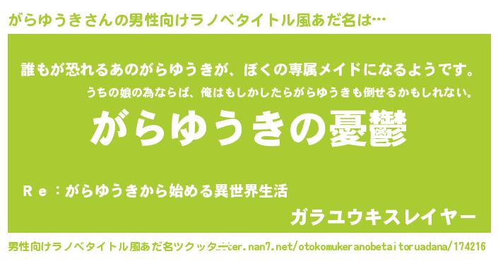 | 女子向けラノベタイトル風あだ名 | 『がらゆうき姫と円卓の騎士』 |