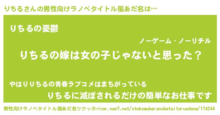 | 女子向けラノベタイトル風あだ名 | 『りちる様がみてる』『死神りちるの再婚』 |