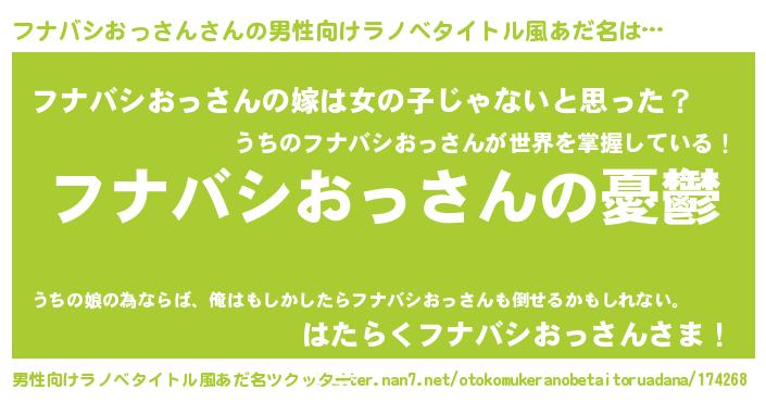 | 女子向けラノベタイトル風あだ名 | 『(仮)フナバシおっさんのやんごとなき事情』 |