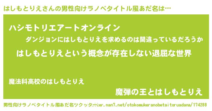 | 女子向けラノベタイトル風あだ名 | 『異世界で失敗しない100のはしもとりえ』 |