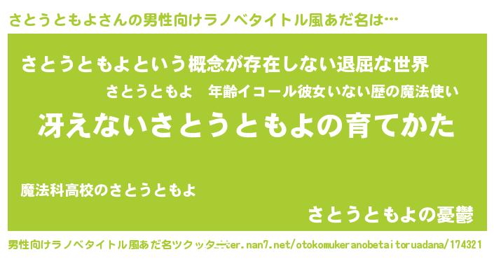 | 胡散臭い通販商品みたいなあだ名 | 『来世でも幸せになれる水素水…その名も「さとうともよ」』 |