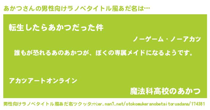 | 女子向けラノベタイトル風あだ名 | 『あかつの契約王妃』『死神あかつの再婚』 |