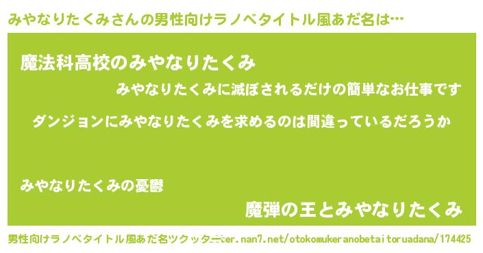 | 女子向けラノベタイトル風あだ名 | 『みやなりたくみの卵を拾いまして』 |