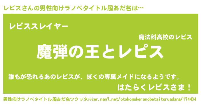 | 女子向けラノベタイトル風あだ名 | 『レピスが死なない童話 林檎のレピスの診療簿』 |