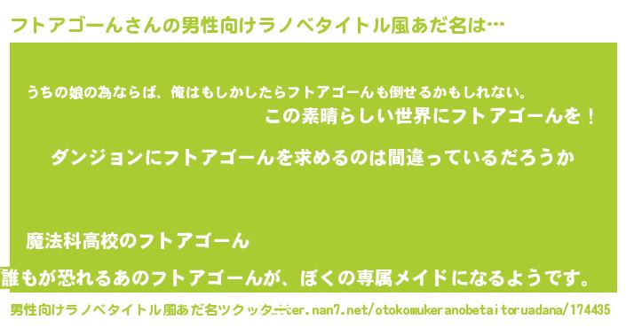 | 女子向けラノベタイトル風あだ名 | 『フトアゴーんの卵を拾いまして』 |