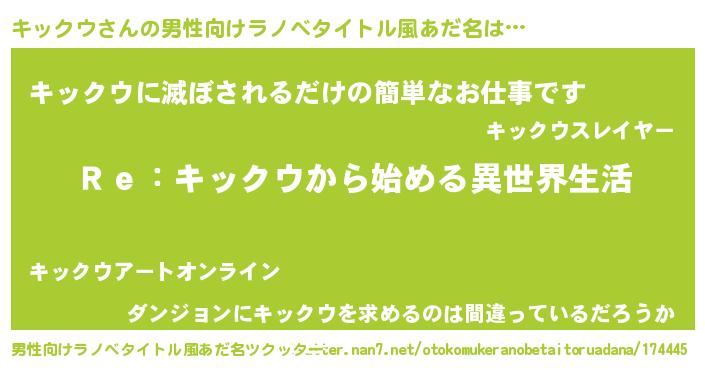 | 女子向けラノベタイトル風あだ名 | 『闇のキックウ』『キックウは平凡を望む』 |