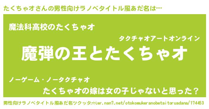 | 女子向けラノベタイトル風あだ名 | 『乙女ゲームの破滅フラグしかない悪役たくちゃオに転生してしまった…』 |