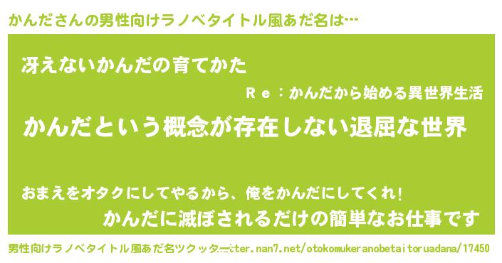 | 女子向けラノベタイトル風あだ名 | 『異世界で失敗しない100のかんだ』 |