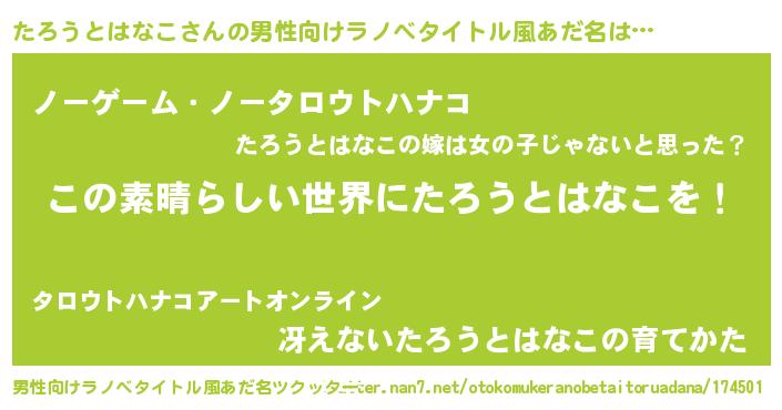 | 胡散臭い通販商品みたいなあだ名 | 『世界中を虜にした100年もののヴィンテージワイン…その名も「たろうとはなこ」』 |