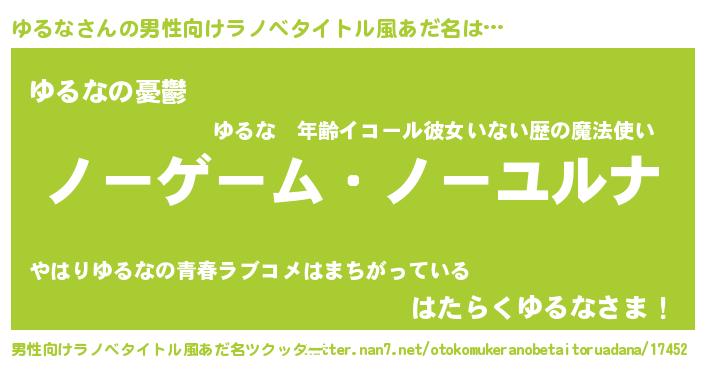 | 女子向けラノベタイトル風あだ名 | 『死神ゆるなの再婚』 |