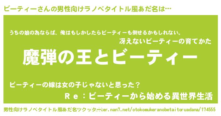 | 女子向けラノベタイトル風あだ名 | 『乙女ゲームの破滅フラグしかない悪役ビーティーに転生してしまった…』 |
