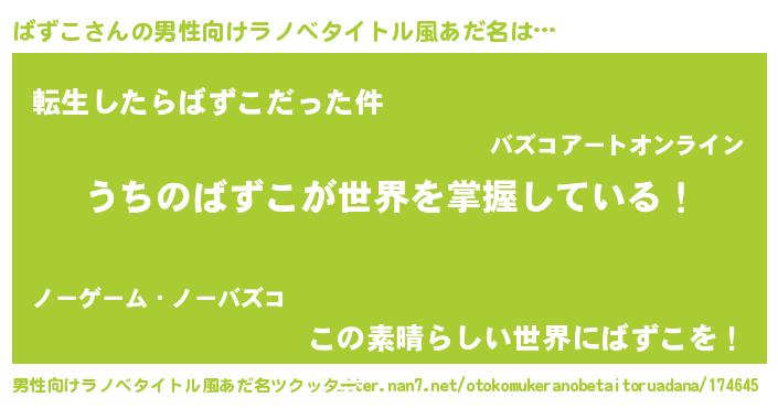 | 胡散臭い通販商品みたいなあだ名 | 『あなたにだけ特別に提供する100年もののヴィンテージワイン…その名も「ばずこ」』 |