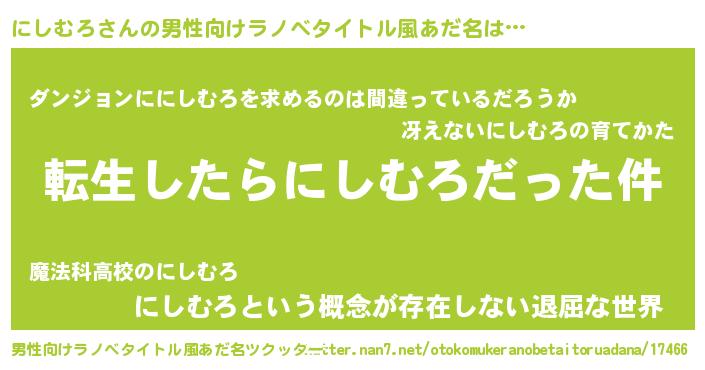 | 胡散臭い通販商品みたいなあだ名 | 『伝統あるサプリメント…その名も「にしむろ」』 |