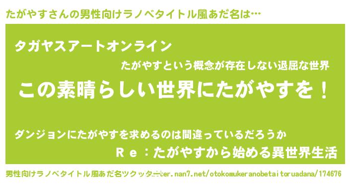 | 女子向けラノベタイトル風あだ名 | 『悪役たがやすに転生したようですが、知った事ではありません』 |
