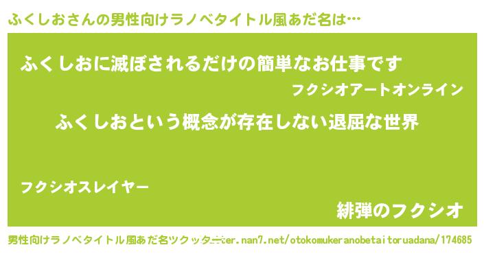| 女子向けラノベタイトル風あだ名 | 『異世界で失敗しない100のふくしお』 |