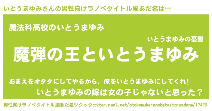 女子向けラノベタイトル風あだ名 | 『乙女ゲームの破滅フラグしかない悪役いとうまゆみに転生してしまった…』 |