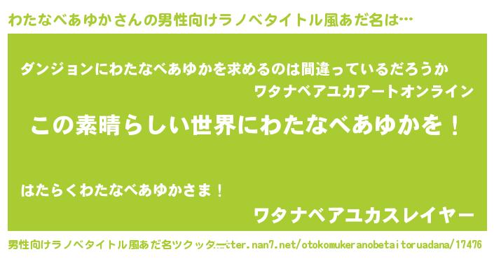 | 女子向けラノベタイトル風あだ名 | 『乙女ゲームの破滅フラグしかない悪役わたなべあゆかに転生してしまった…』 |